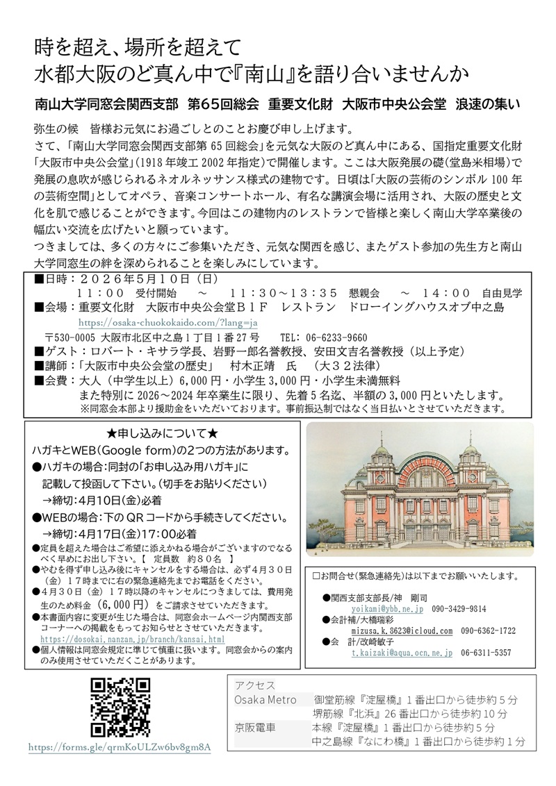 「大阪市中央公会堂」(1918年竣工2002年指定)で開催します。多くの方々にご参集いただき、元気な関西を感じ、またゲスト参加の先生方と南山大学同窓生の絆を深められることを楽しみにしています。