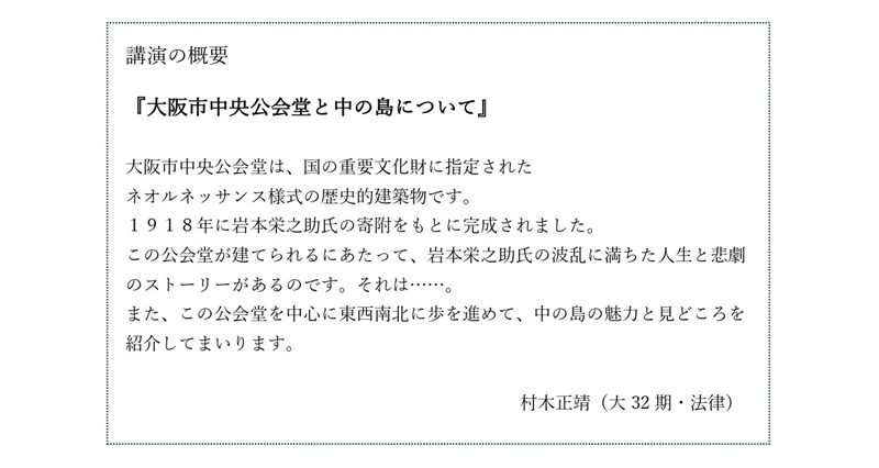 ■講師:「大阪市中央公会堂の歴史」 村木正靖 氏 (大32期・法律)