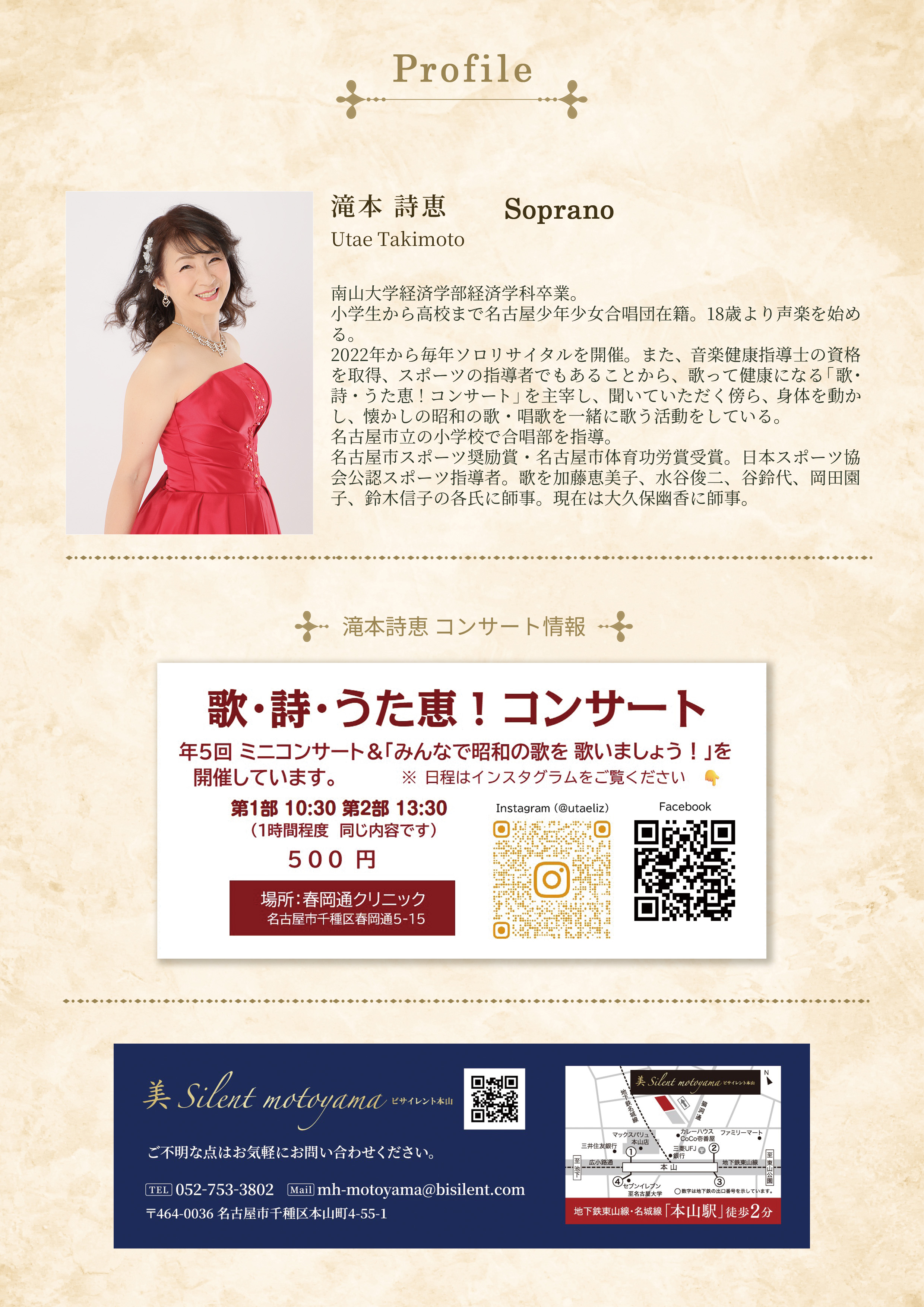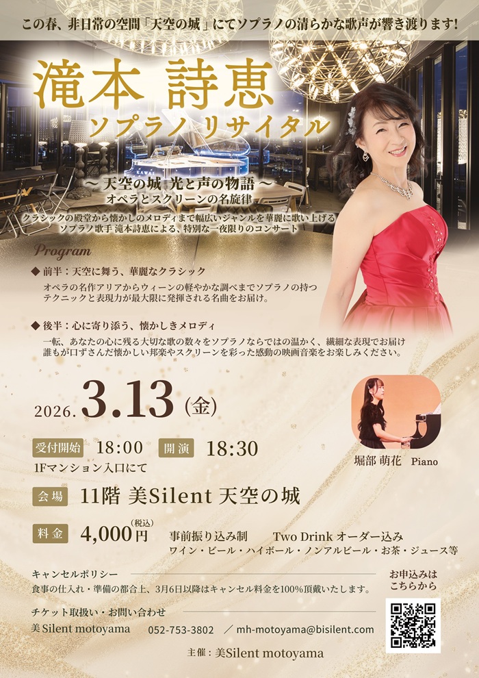 『滝本詩恵ソプラノリサイタル』を、美 Silentさん主催で開催いたします。